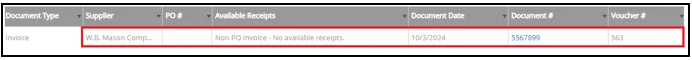In the table of vouchers, locate the correct invoice. The Supplier, Document Date, and Document # added on the Scan Match will appear. The invoice will also be assigned a Voucher #: