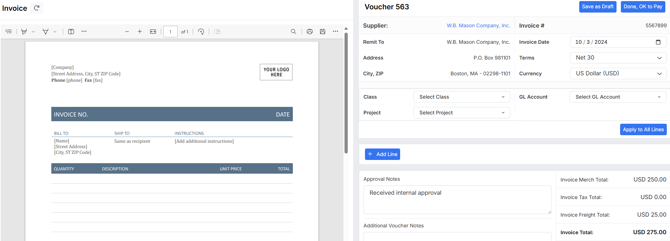 The next screen will display the uploaded invoice on the left. On the right will be fields for users to complete to match the uploaded invoice: