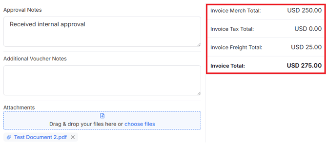 Ensure that all details are complete and accurate including that the Invoice Merch Total, Invoice Tax Total, Invoice Freight Total, and Invoice Total match the uploaded invoice. Approval Notes will display notes users add when bypassing approval on the Scan Match: