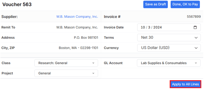If the Accounting Segments will be the same for each line and have been selected at the top of the screen, users can select Apply to All Lines for segments to automatically populate for each line: