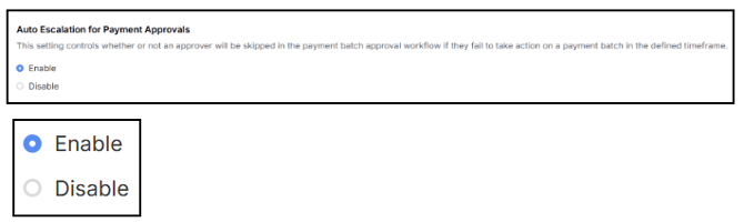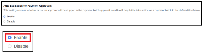 Enable - Select to automatically move a payment batch to the next approver if the current approver doesn't respond within a set time. This ensures that payments are not held up due to inactivity.