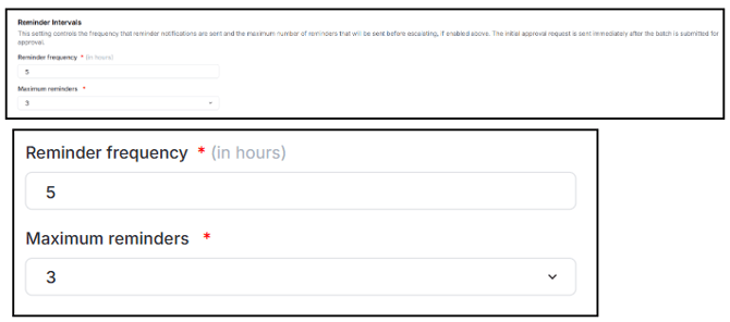 Reminder frequency - How often (in hours) should reminder emails be sent to the approver? Enter a number between 1 and 72. This allows you to balance the need for timely approvals with the risk of overwhelming approvers with notifications.