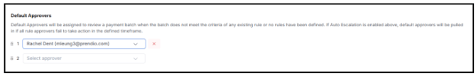 If the approver(s) for a custom rule does not respond in a specific timeframe, and auto escalation is Enabled, the payment batch will move to Default Approvers set in Approval Settings: