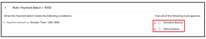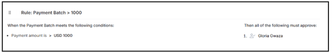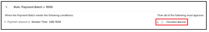 Below is a custom rule, Payment Batch > 1000. If a payment greater than $1,000 is submitted, Christine will be prompted to review and approve the payment before it can be processed: