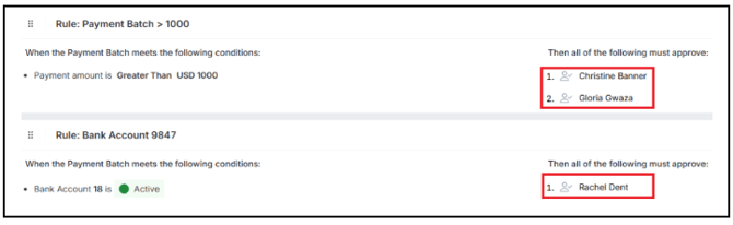 If a payment batch meets the criteria of multiple rules, the approvers for each rule will be prompted to review and approve the payment before it can be processed.