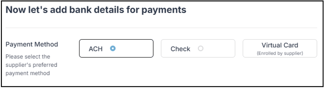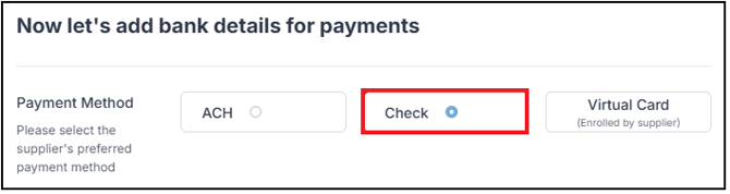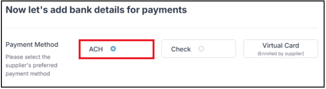 In the Add bank account section, indicate the supplier's preferred payment method, ACH for payments to be delivered directly to the supplier's bank account, or Check or a paper check to be mailed to the supplier's remit address:
