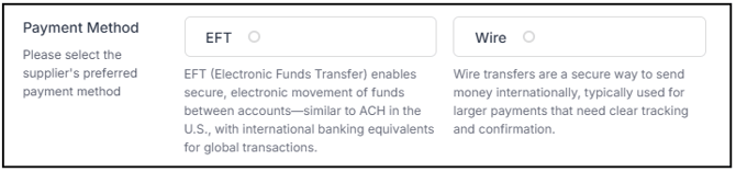 Please note that most bank details will be Wire. EFT is only selected if the supplier has a U.S. Bank account.