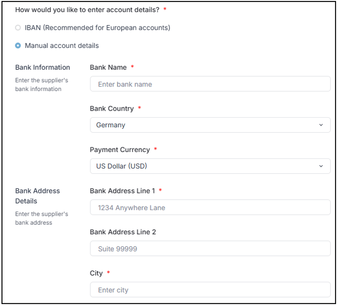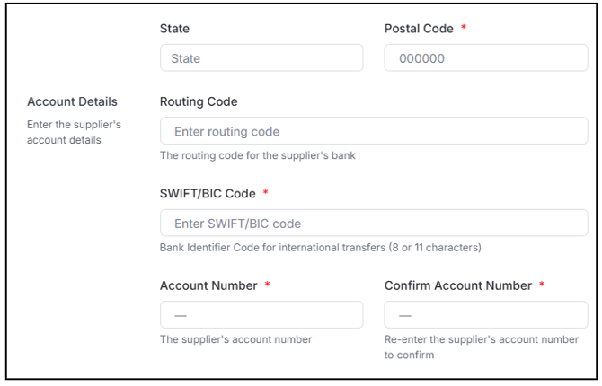 Complete the complete details for the supplier's bank account including the Bank Name, Bank Country, Payment Currency, Bank Address, Routing Code, SWIfT/BIC Code, and Account Number. Please ensure and check all information is correct to avoid failed payments to the supplier: