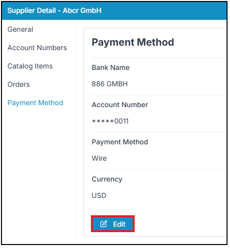 The new Payment Method will save for the supplier. Adjustments can be made by selecting Edit: