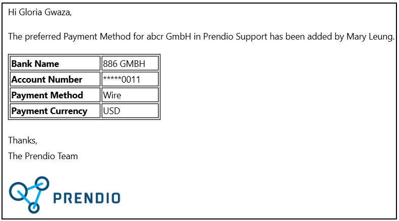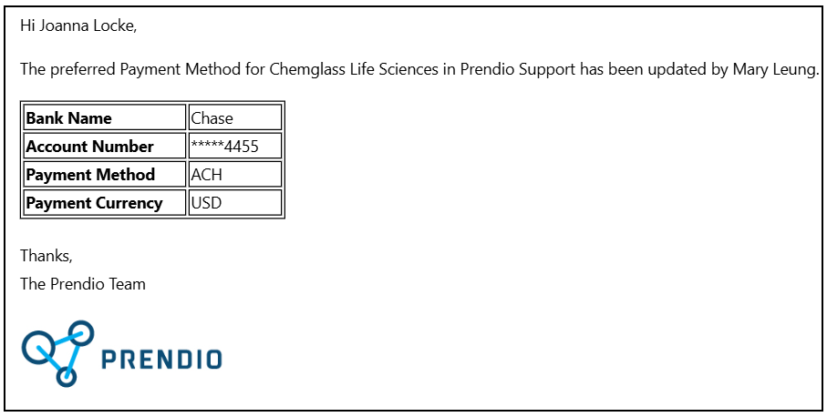 Any users with the Payment Setup role at a company will receive an email notification indicating that the Payment Method for an international supplier has been updated: