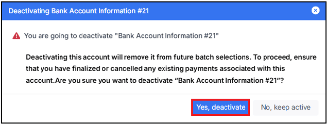 Please note that bank accounts cannot be Disabled if there are payments in progress under the account.