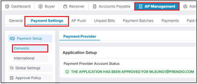 After an application is Active, the Bank Accounts Setup section will be available. Navigate to AP Management > Payment Settings > Payment Setup > Domestic: