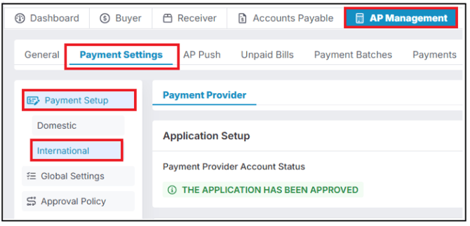 After an application is Active, the Bank Accounts Setup section will be available. Navigate to AP Management > Payment Settings > Payment Setup > International: