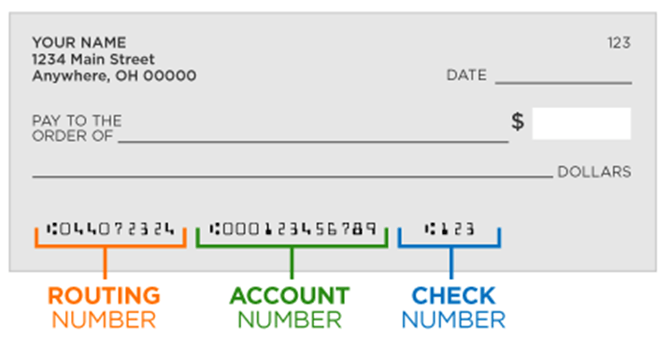 Please ensure that the correct account is being used and that the account and routing numbers are verified. A sample check below displays the routing, account, and check numbers:
