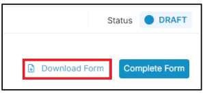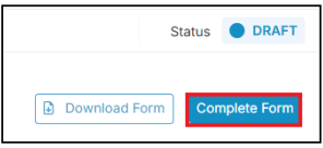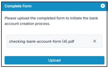 The form will be pre-populated with bank account details completed in Prendio. Verify the information is correct and have the appropriate party sign the form. Upload the completed form by selecting Complete Form followed up Upload in the popup window: