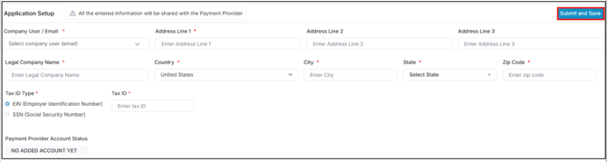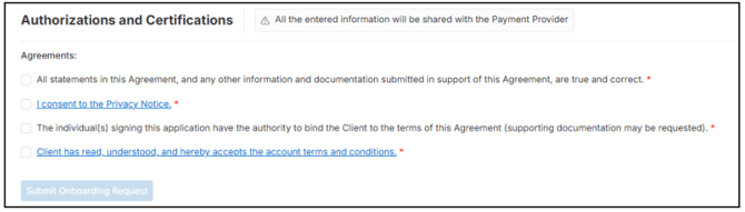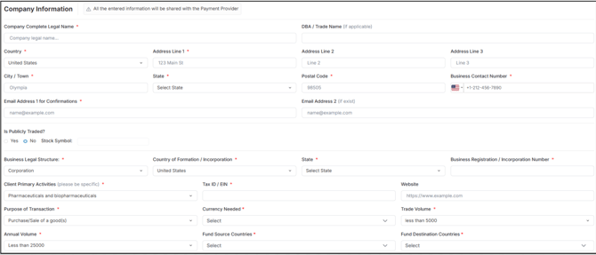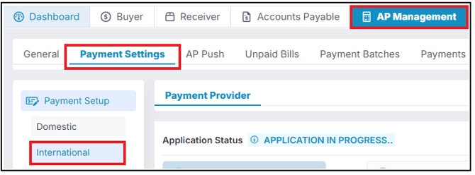 Separate applications for domestic and international payments must be completed in the Prendio UI before the feature can be used. Additional information and documents must also be submitted to each payment partner. Copies of the UI applications are seen below along with a list of required forms and documents.