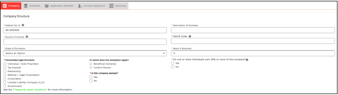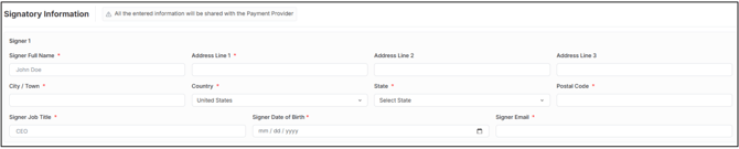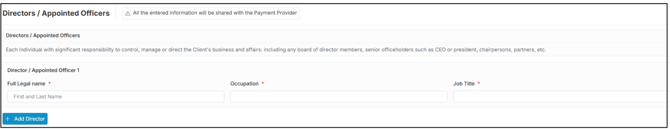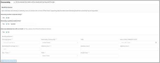 After the initial application has been submitted in Prendio, the domestic payment partner will email the user (within 24 hours) an additional application to be completed with documents to upload. Below is a copy of the application for review: