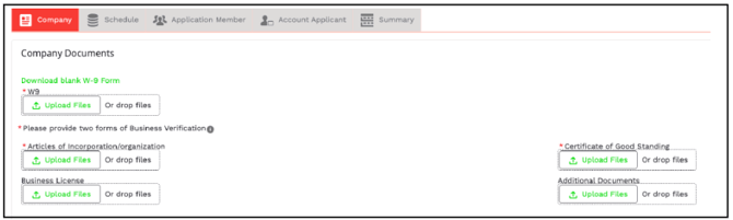 After an application is approved, users must add a bank account and submit additional documents. These documents can be uploaded directly to the Prendio UI and include: