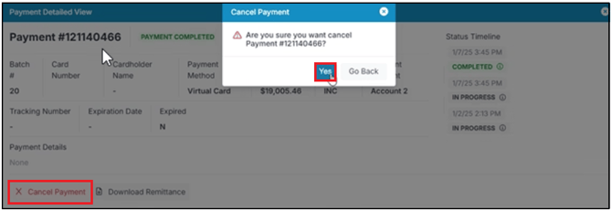 Virtual Credit Cards - For any virtual cards, clients will have an option to cancel by locating the correct invoice and opening the Payment Detailed View window.