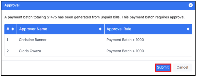 An approval window displaying all approvers required to review the payment batch will appear. Select Submit: