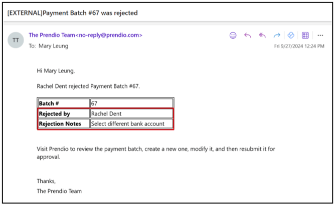 When a Payment Approver rejects a payment batch, a reason must be included before submitting. After a payment is rejected, the original payer of the payment will receive an email notification with the Rejection Notes: