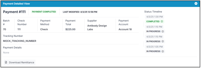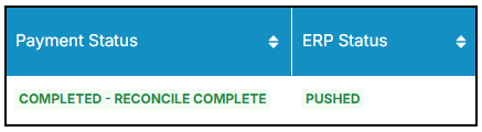 After a payment batch is complete and pushed to an ERP system, users can track payment details by selecting View in the Actions column: