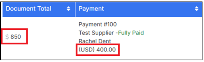 In the example below, the Document Total is $850; however, a partial payment of $400 was made on the voucher reflected in the Payment column: