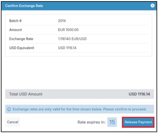 User have 15 seconds in this window to confirm the exchange rate via Release Payment. After 15 seconds, the window closes; howver, users can select View again to open the window and confirm.