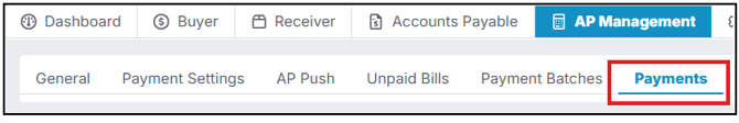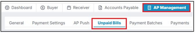 After a user with the AP Management role pushes a voucher to an ERP system, the voucher moves from the AP Push to Unpaid Bills. These invoices will also exist in the company’s ERP system. Users with the Payer role can process payment batches to suppliers in Unpaid Bills.
