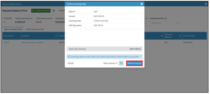After clearing approvals, users must confirm the exchange rate and release the batch for international payments in Payment Batches.