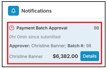 Approvers for a payment batch will receive a notification on their Dashboard via the Notifications section: