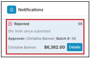 On the Dashboard, locate the Notifications section to display the payment batch rejection notification: