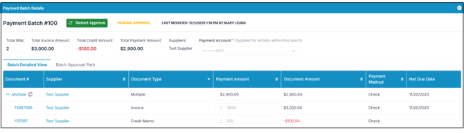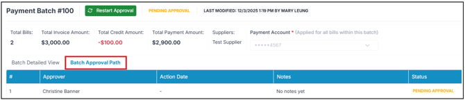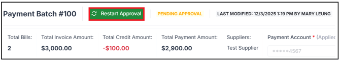 If the approval for a payment batch needs to be restarted, users can select Restart Approval (Approvals may require a restart if changes have been made in Approval Settings or Approval Policy):