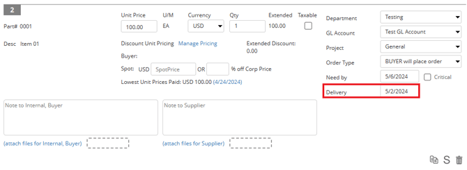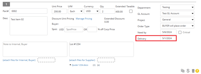 Update the Delivery date for each item as needed based on the ETA the supplier has provided. In the example below, the user requested for the order to be delivered by 05/06/2024 via the Need by field. The supplier confirmed that the item may be delivered sooner on 05/02/2024. The Delivery field is updated to 05/02/2024 to reflect this delivery date: