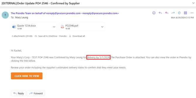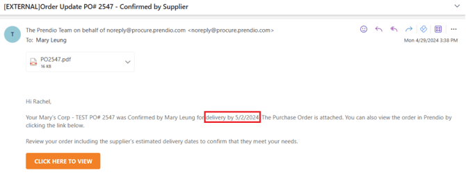 The user will receive an email indicating their order is confirmed by the supplier along with the delivery date: