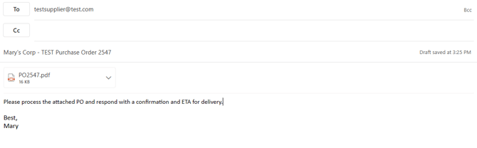 Another option is to email the PO to yourself and then forward the PO to the supplier outside of Prendio. This allows the Buyer to have a record of the email, adjust the message of the email, and add other features such as a Read Receipt for the supplier.