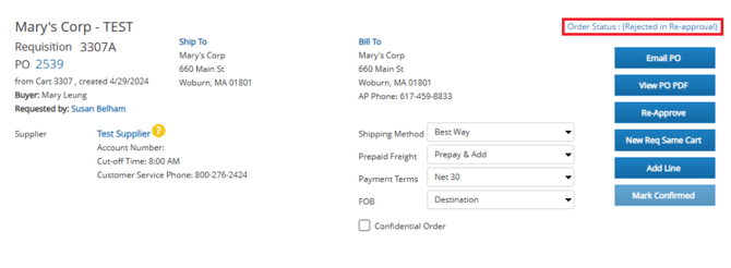 The details of the PO will now appear. Any lines for additional funds will not appear in the PO as they have been rejected. To find the rejection reason for the PO, find Order Status located at the top right. Click on the Order Status, which should be Rejected in Re-approval: