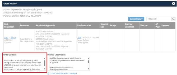The Order History window appears. On the bottom left of the window will show the Order Updates indicating why the Approver rejected the PO: