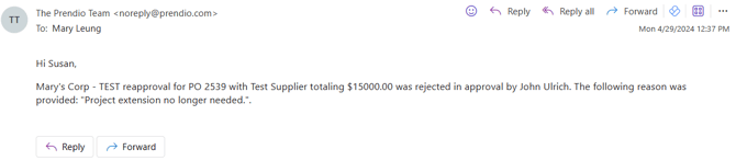 Users are notified by email whenever a PO that has been sent through re-approval has been rejected: