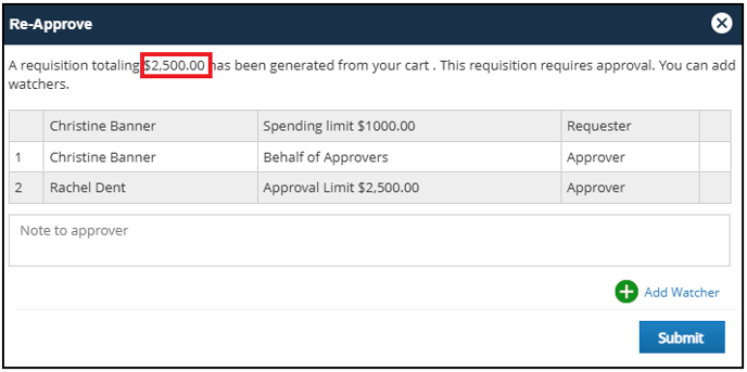 The next window displays all approvers required to approve the new PO Total. Please note that when sending a PO back through approvals, the approval is for the new PO amount and not just the difference required to increase the PO total.