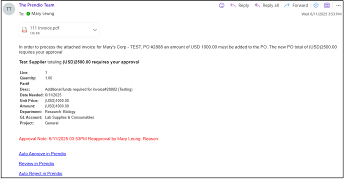 - I approve PO and Receipt is Complete: You approve the request for additional funds as-is