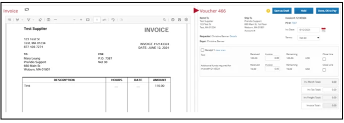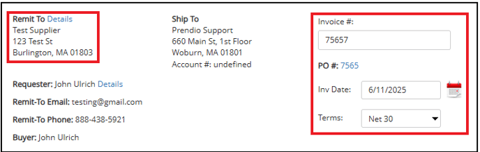 Confirm that the Invoice Total in Prendio matches the total on the uploaded invoice. Confirm all details in Prendio match the invoice details. These include the Remit To address for the supplier, Invoice #, PO #, Invoice Date, and Terms: