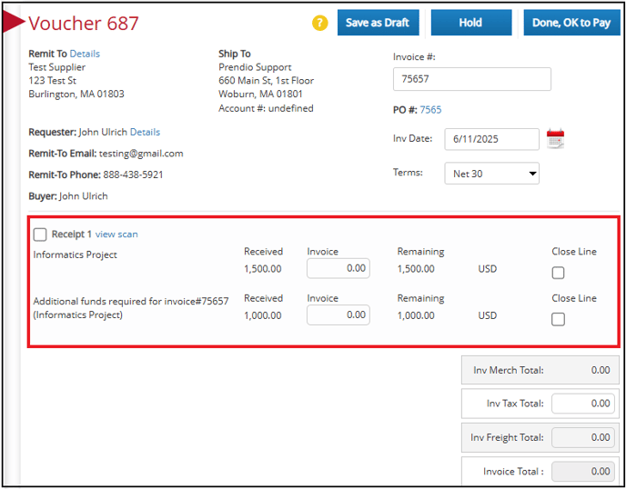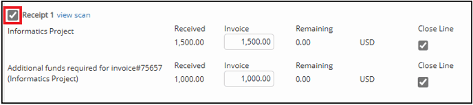The receipt will also be seen in the voucher view. A note will also be included to indicate that additional funds have been added to process the invoice: